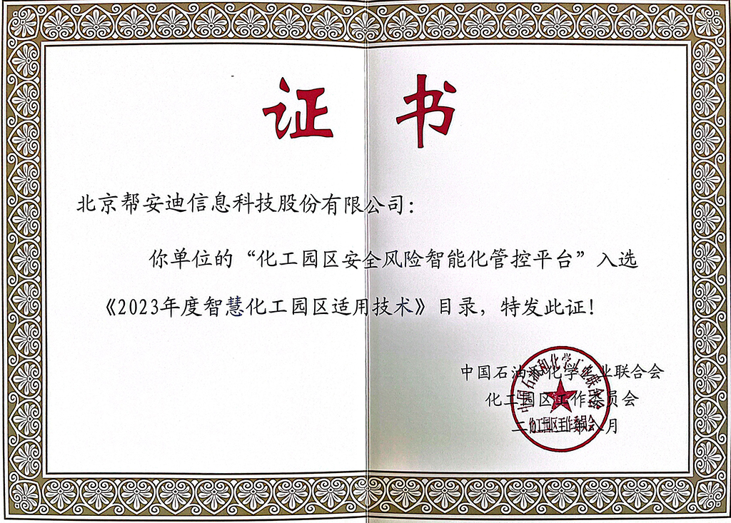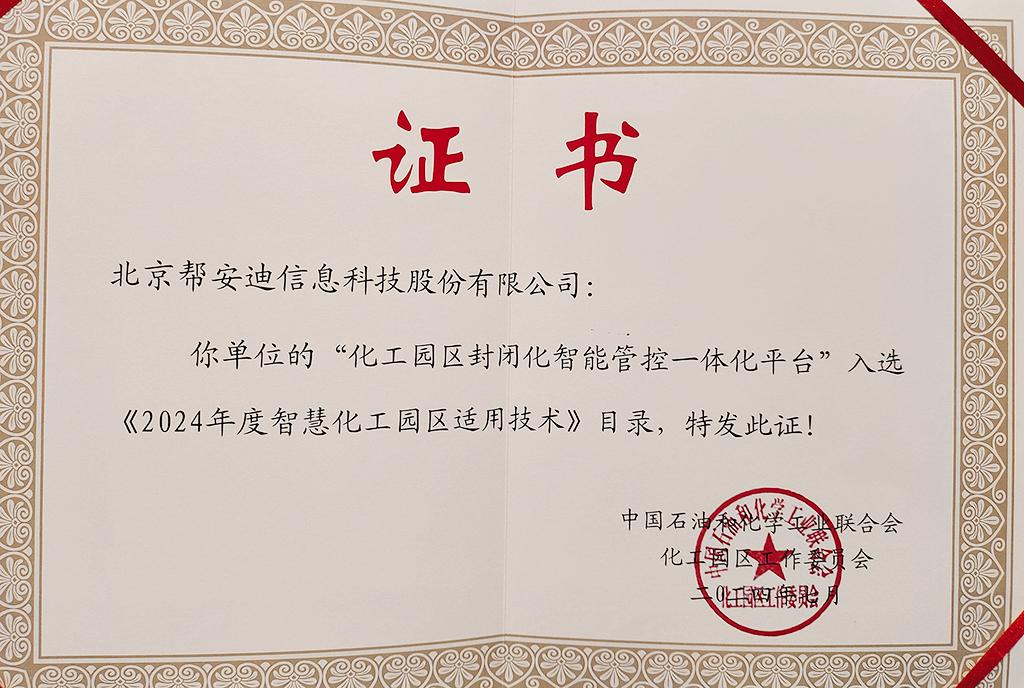 近日,中国石油和化学工业联合会化工园区工作委员会正式发布“2025年(第五批)智慧化工园区适用技术目录”,北京帮安迪信息科技股份有限公司(以下简称“帮安迪”)自主研发的“高风险特殊作业智能监测监控系统”凭借其卓越的技术创新性与行业适用性,从众多申报技术中脱颖而出,成功入选。这标志着帮安迪核心产品连续三年获得此项权威认可,充分体现了公司在智慧化工园区建设领域的技术领先地位与持续创新能力。