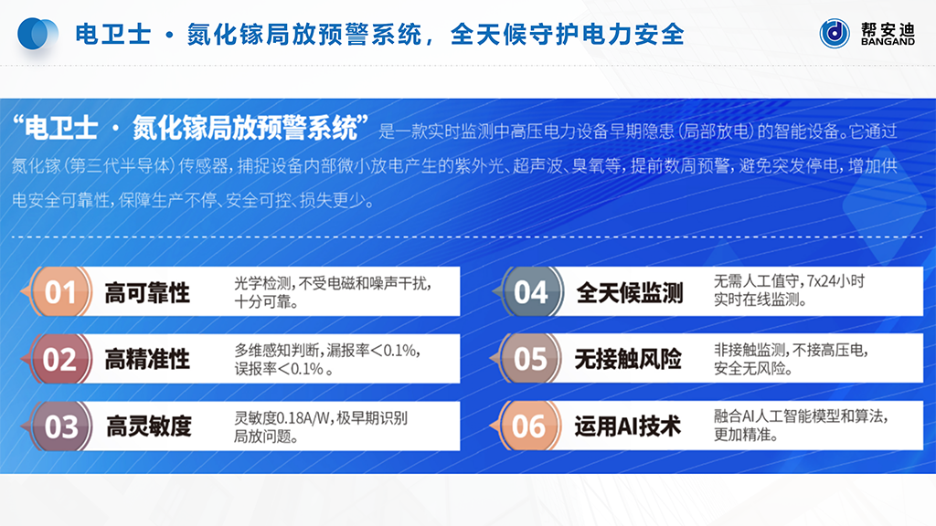 Power safety cannot wait until a fault occurs to be repaired. Bangandi’s “Electric Guardian · GaN Partial Discharge Early Warning System” uses advanced optical sensing and AI technology to extend the early warning window for power hazards from “hours” to “weeks,” truly stopping power faults before they happen. If you want your enterprise’s power distribution system to shift from “passive response” to “active defense,” please contact us (400-8989-611) for more product details and deployment solutions.