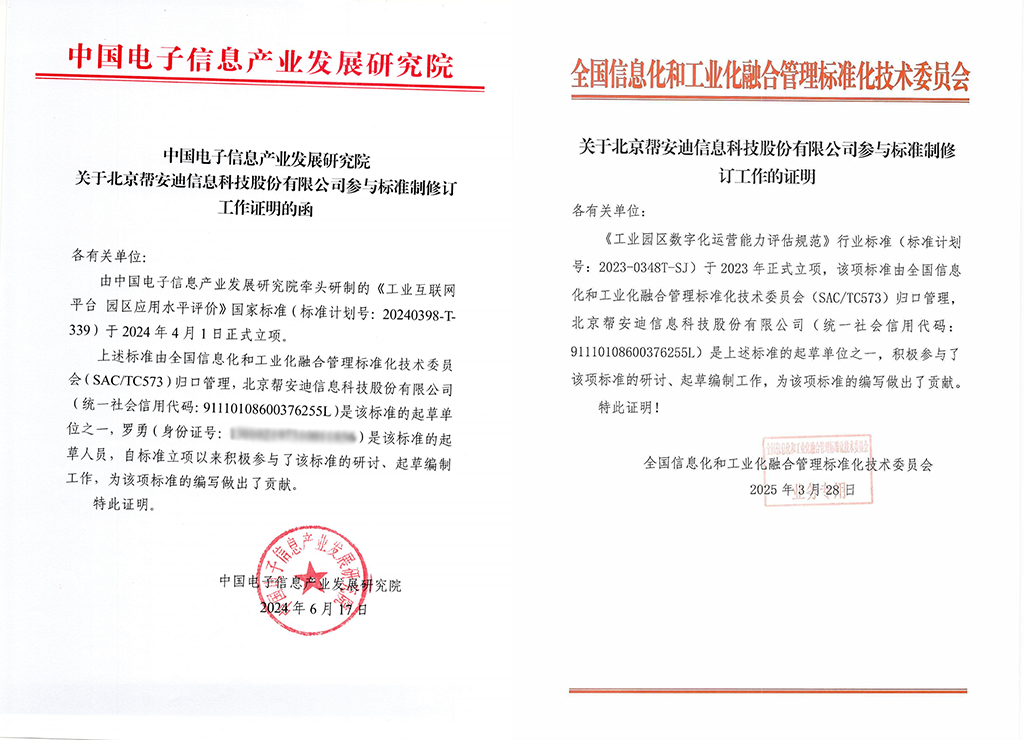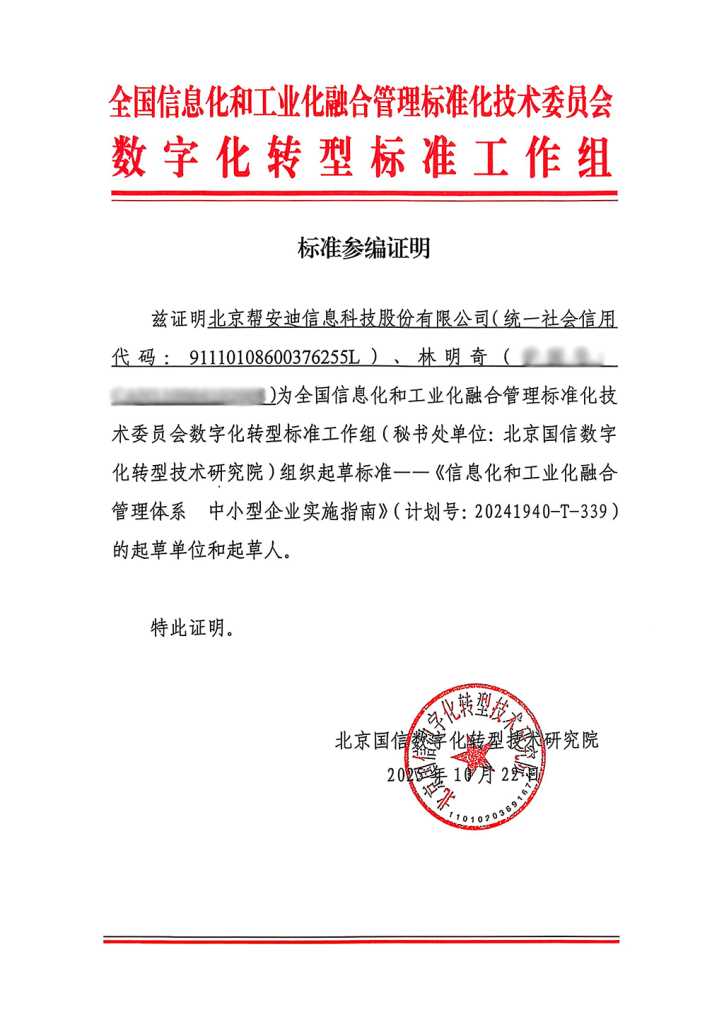 在数字经济与实体经济深度融合的时代背景下,标准已成为引领产业变革、构筑竞争新优势的核心要素。近日,帮安迪凭借其在工业互联网和安全生产数字化领域的深厚技术积淀,成为国家标准《信息化和工业化融合管理体系 中小型企业实施指南》(计划号:20241940-T-339)的起草单位,积极参与该项标准的研讨、起草编制工作。截至目前,帮安迪成功参与了8项国家标准以及1项行业标准的编制工作。这一重要成就不仅体现了公司在相关领域的技术实力,更彰显了其推动行业规范化发展的责任担当,标志着帮安迪在推动两化深度融合、赋能产业智能化升级方面的实践与贡献获得了国家与行业的高度认可。
