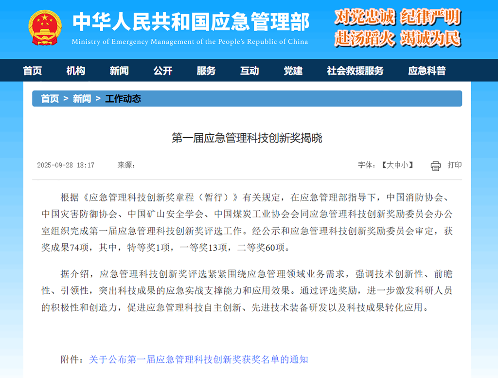 “应急管理科技创新奖”是在应急管理部指导下,由中国消防协会、中国灾害防御协会、中国矿山安全学会、中国煤炭工业协会等单位联合设立并评审的综合性社会科技最高奖,具有跨灾种、跨行业的重要影响力。奖项评选严格,注重项目的创新性、代表性、经济社会效益及实战效果。帮安迪申报的项目能从众多优秀成果中脱颖而出,充分体现了其技术的先进性与实用性。