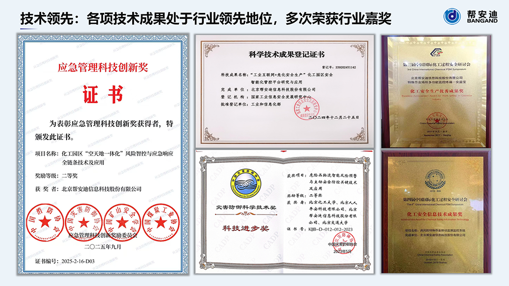 此外,帮安迪在工业安全智能化领域持续深耕,屡获殊荣,多项技术与产品处于行业领先地位。例如,《化工园区“空天地一体化”风险智控与应急响应全链条技术及应用》项目荣获“首届应急管理科技创新奖二等奖”;《“工业互联网+危化安全生产”化工园区安全智能化管控平台研究与应用》项目荣获工业和信息化部批准颁发的“科学技术成果登记证书”;“危险品物流智能风险预警与主动安全防控关键技术及应用”成果荣获“2022年度灾害防御科学技术奖-科技进步奖二等奖”;“高风险特殊作业移动监测监控终端”曾在第三届/第四届中国国际化工过程安全研讨会上,分别荣获“化工安全生产优秀成果奖”和“化工安全信息技术成果奖”。