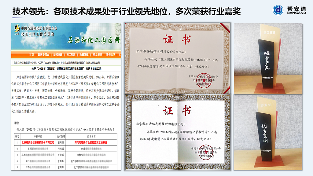 同时,“化工园区安全生产智能化管控平台”入选《2023年度智慧化工园区适用技术》目录;“化工园区封闭化智能管控一体化平台”入选《2024年度智慧化工园区适用技术》目录;“高风险特殊作业智能监测监控系统”入选《2025年度智慧化工园区适用技术》目录;帮安迪承建的“工业互联网+危化安全生产平台”助力湖北江瀚新材料股份有限公司荣获“中国氟硅行业最佳安全实践案例”奖,助力河北鑫海化工集团有限公司荣获“优秀案例”奖;帮安迪承建的“安全风险智能化管控平台”助力潍坊滨海化工产业园获评“山东省化工产业智能化改造标杆园区”等。