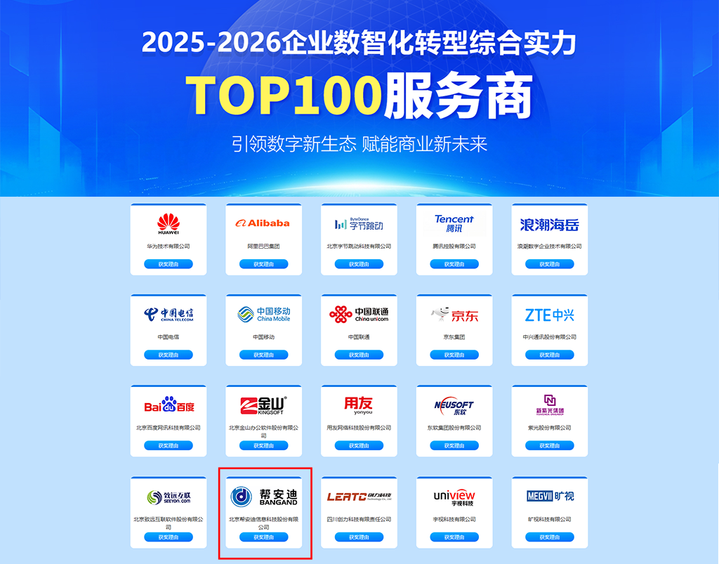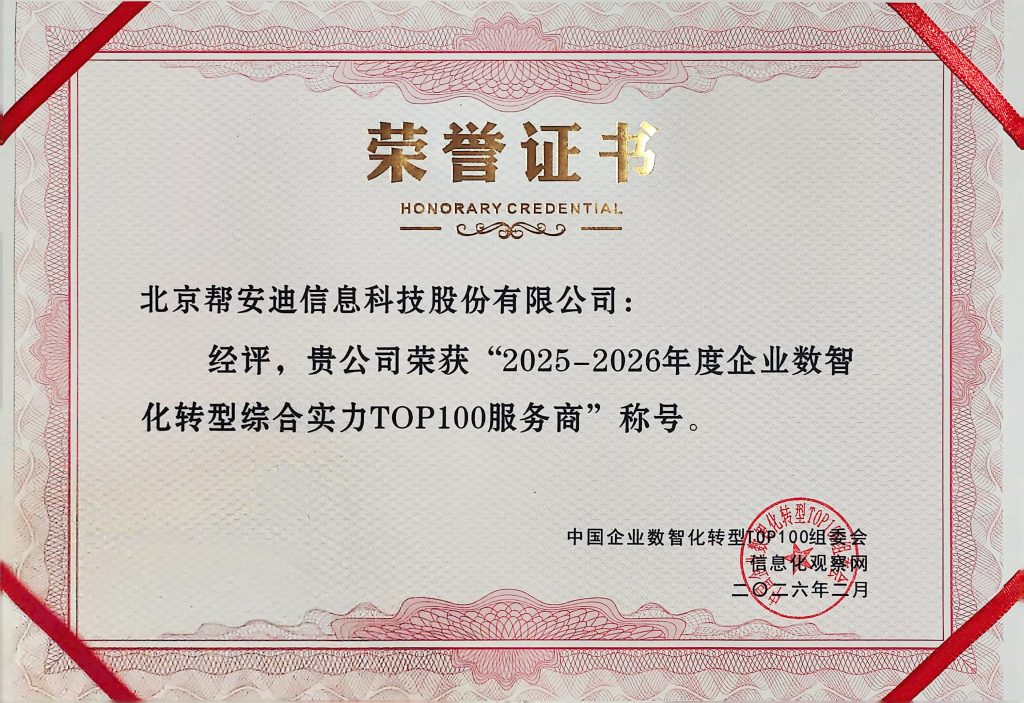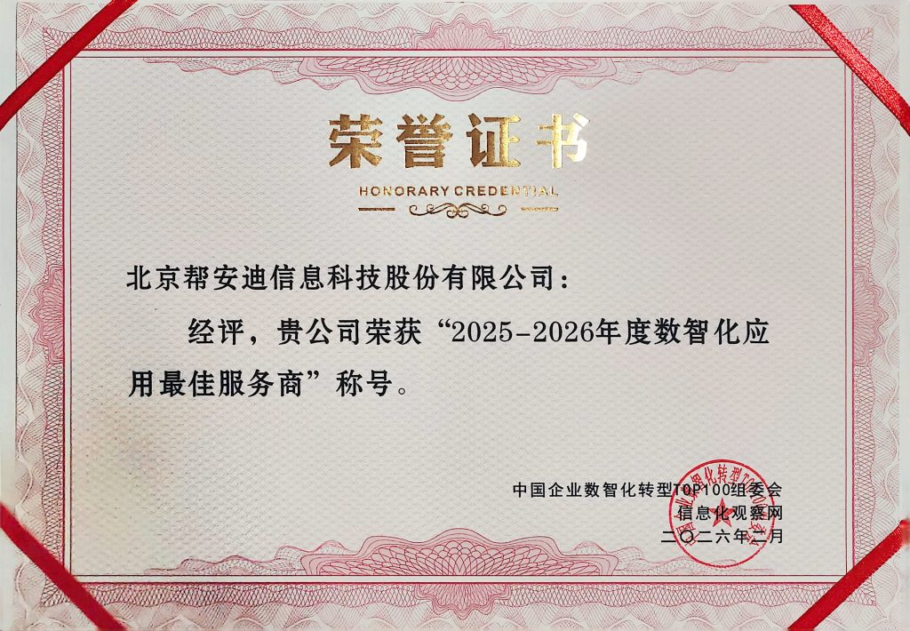 近日,北京帮安迪信息科技股份有限公司(简称“帮安迪”)凭借其在数智化领域深厚的技术积累与卓越的服务能力,成功入选“2025-2026年度企业数智化转型综合实力TOP100服务商”,并同时获评“2025-2026年度数智化应用最佳服务商”,荣获权威机构颁发的荣誉证书与奖杯。这标志着帮安迪在推动企业数字化转型方面的技术实力与行业引领作用获得了高度认可,进一步巩固了其在企业数智化服务领域的标杆地位。